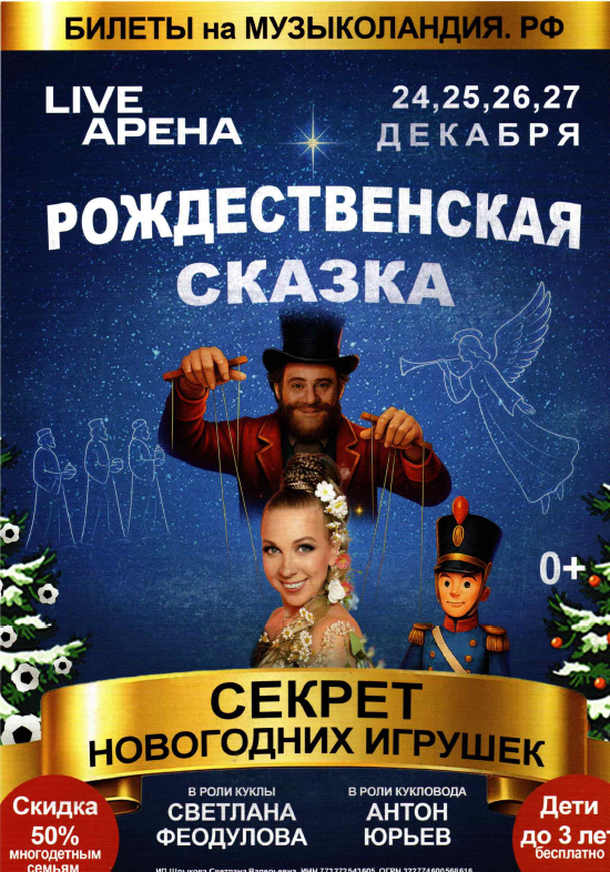 В период с 24 по 27 декабря 2025 года на сцене «Live Арена» (Московская обл., Одинцовский р-н, Новоивановское, ул. Западная, дом 145; проезд: МЦК-1 ст. «Сколково») семь раз будет представлена рождественская сказка для детей «Секрет новогодних игрушек» с участием оперной певицы Светланы Феодуловой.