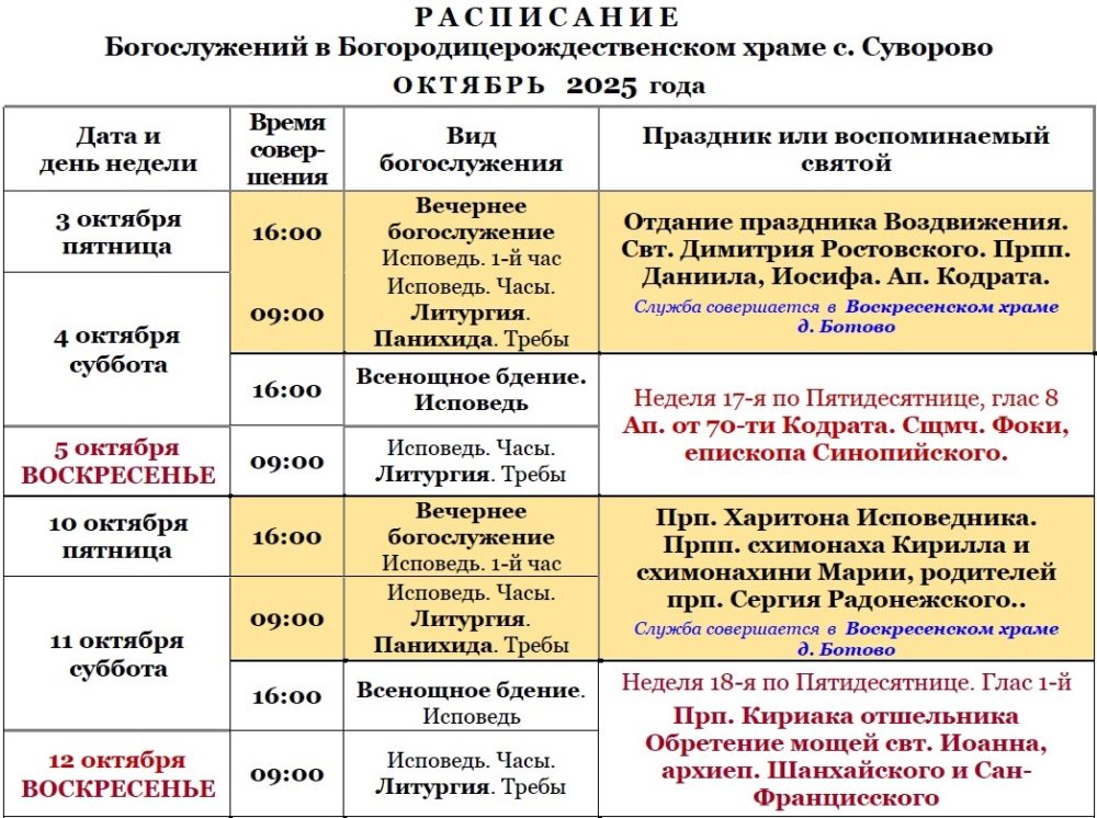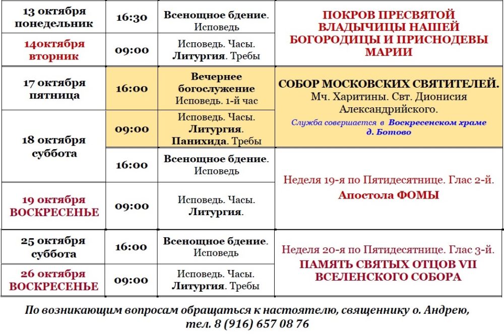 5 октября 202522 сентября 2025 (по ст.ст.)ВоскресеньеНеделя 17-я по ПятидесятницеИкона Богородицы «Услышательница» («Зографская») Преподобный Макарий Жабынский, Белевский, иеросхимонахСвященномученик Фока Синопский, епископСобор Алтайских святыхПророк ИонаПреподобный Иона Палестинский, пресвитерБлаженная Параскева ДивеевскаяПреподобный Иона ЯшезерскийСобор Тульских святыхМученик Фока Вертоградарь (Садовник), СинопскийПраведный Петр АфриканскийСвященномученик Феодосий Бразский, митрополитСвященномученик Вениамин (Воскресенский), Романовский, епископБлаговерный князь Иоанн I Данилович КалитаПреподобномученик Киприан Зографский (Афонский)Благоверный князь Михаил Всеволодович, ЧерниговскийПреподобномученик Никон, ученик прмч. Кукши ПечерскогоСвятитель Пимен, архиепископ НовгородскийСвятитель Феоктист Печерский, епископ ЧерниговскийПреподобный Варсонофий ЩегловскийСвятой Иаков Поспелов Святитель Иоанникий РудневСвященноисповедник Василий КинешемскийЛк.24:36–53, 2Кор.6:16–7:1, Лк.5:1–11, Евр.4:14–5:6, Ин.10:9–16Новости Патриархии